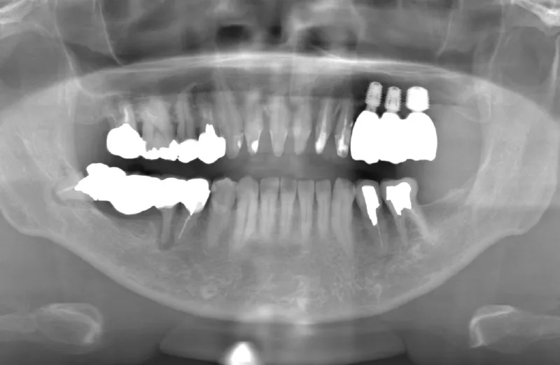 | 治療内容 | エクストラワイドショートインプラントを埋入し、上顎洞を移植材を用いずに挙上しインプラントを埋入した。 仮歯を装着し、様々な機能面に問題がないことを確認し4.5ヶ月で最終補綴物を装着して終了した。 |