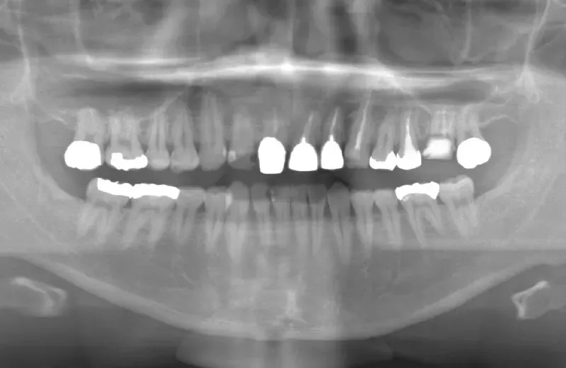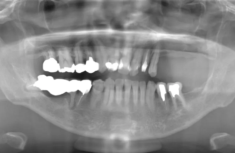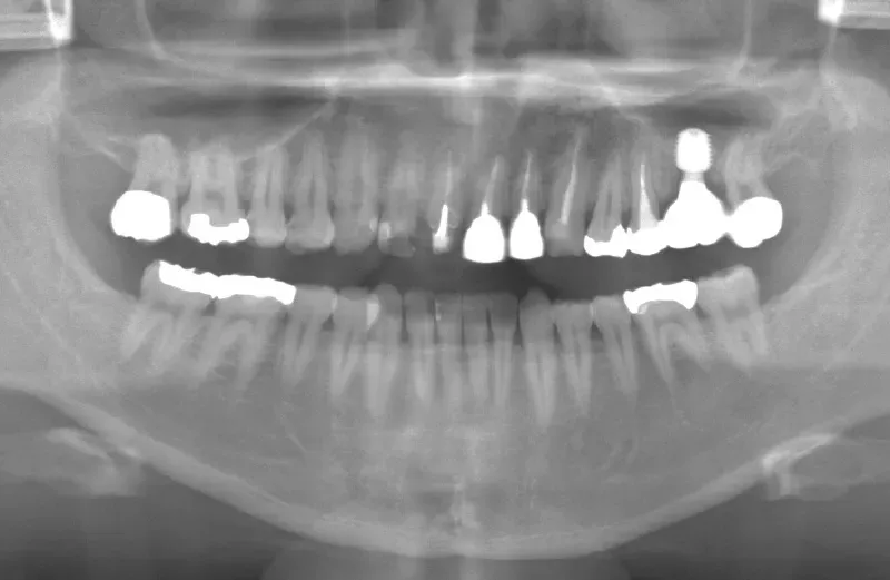 | 主訴 | 入れ歯は以前に入れたことがあるが違和感が強く入れられなかった。これ以上歯を失いたくないので右上をインプラントで治療して欲しい。その他の歯もなるべく残して欲しい。 他院では右上は上顎洞までの垂直骨量が2~3mm程度しかないのでサイナスリフトが必須であり、インプラント治療に1年以上かかると言われたのでセカンドオピニオンを希望で来院。 |