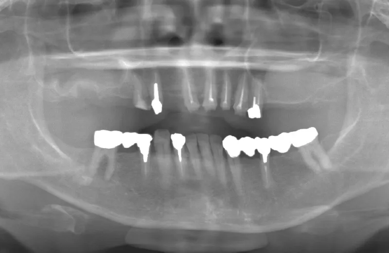 | 主訴 | 入れ歯は以前に入れたことがあるが違和感が強く入れられなかったので右上左上をインプラントで治療して欲しい。 左上は他院では上顎洞までの垂直骨量が1mm程度しかないのでサイナスリフトが必須であり、インプラント治療で歯が入るまでに1年以上かかると言われたのでセカンドオピニオンを希望で来院。 |